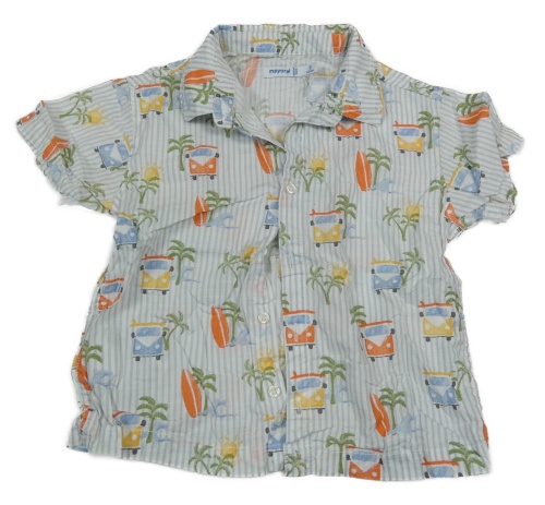 Světlemodro-biela pruhovaná košeľa s autobusmi a palmami a sufrmi mayoral