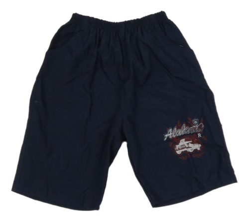 Tmavomodré plátenné kraťasy s autom a nápisom