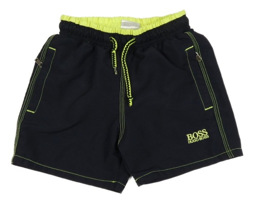 Tmavomodro-kriklavoě žlté plážové kraťasy s logom Hugo Boss