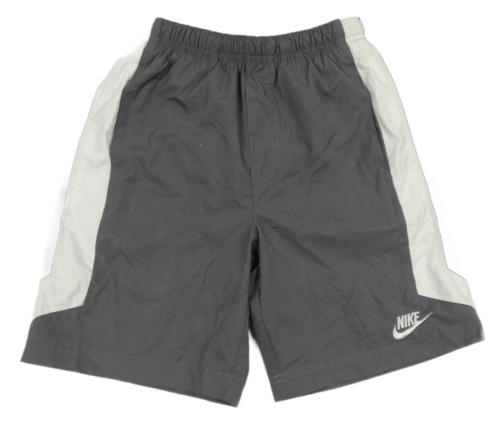 Tmavosivé šušťákové športové kraťasy s bielým pruhom a logom Nike