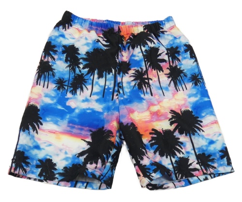 Modro-ružovo-žlté šušťákové kraťasy s palmami