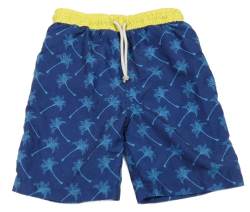 Tmavomodro-žlté plážové kraťasy s palmami