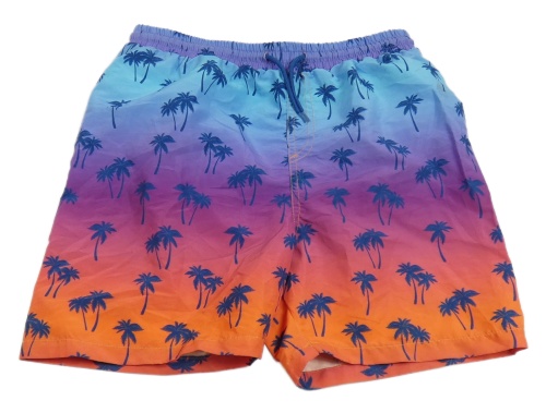 Modro-fialovo-oranžové plážové kraťasy s palmami
