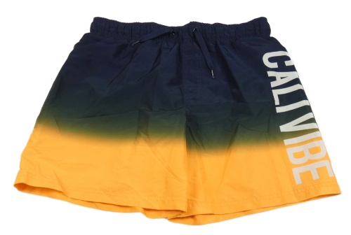 Tmavomodro-oranžovo-khaki šušťákové plážové kraťasy s nápisom