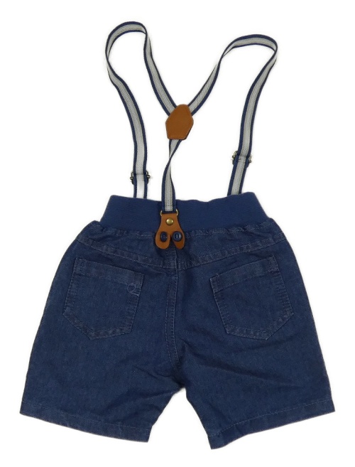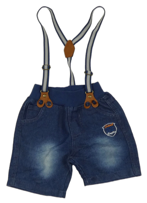 Modré teplákové rifľové kraťasy so znakom s číslom a nápismi a trakami