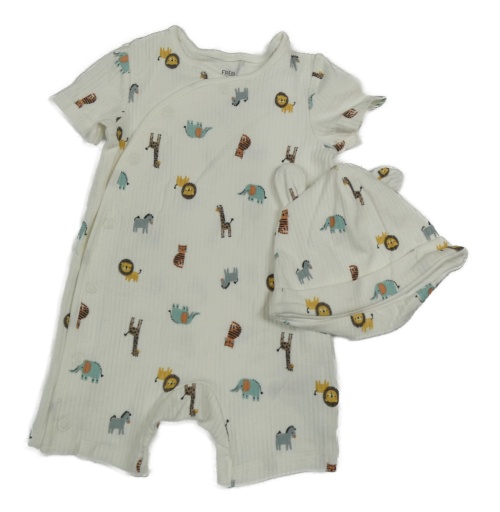 Nové - 2Set - Biely rebrovaný kraťasový overal so zvířátky + čapica s uškami F&F