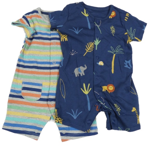 Nové - 2x kraťasový overal - šedo-barevný pruhovaný + tmavomodrý s palmami George