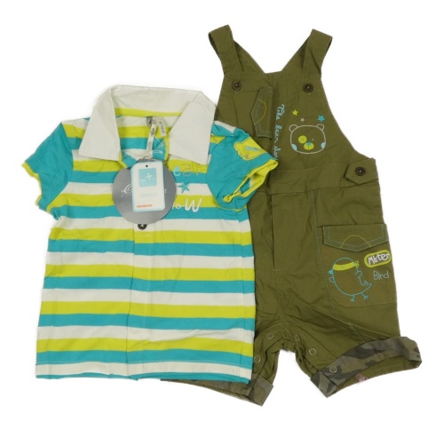 Nové - 2Set - Khaki plátenné na traké kraťasy s medvídkem + pruhované prepínaci tričko s nápismi a golierikom Orchestra Bébé