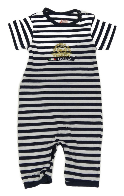 Tmavomodro-biely pruhovaný bavlnený kraťasový overal s výšivkou