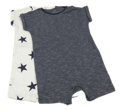 Nové - 2x kraťasový overal - bílý s hvězdami + tmavomodrý pruhovaný Next