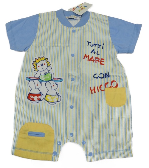 Nové - Bielo-modro-žltý pruhovaný kraťasový overal so zvířaty a nápisom