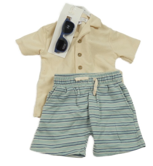 • Nové - 3 set - smotanové úpletové prepínaci polo tričko + modré pruhované kraťasy + sluneční okuliare