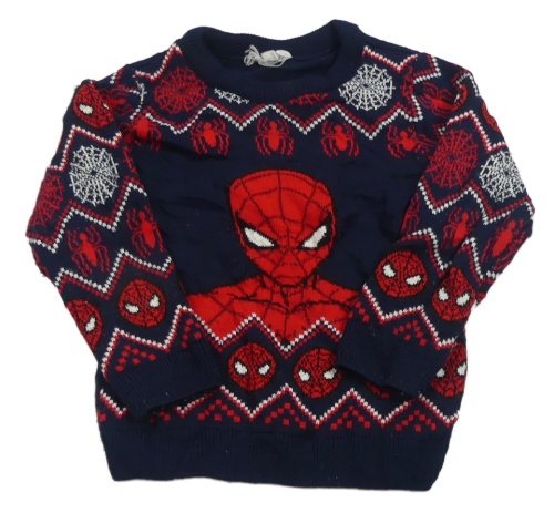 Tmavomodro-červený vzorovaný sveter so Spidermanem