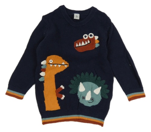 Tmavomodrý rebrovaný sveter s dinosaurami a pruhmi Tu