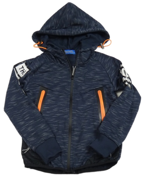 Tmavomodrá melírovaná prepínaci športová mikina s nápismi a kapucňou