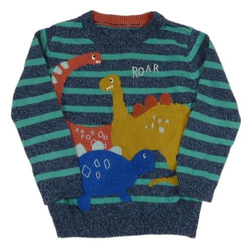 Tmavomodro-tyrkysový pruhovaný sveter s dinosaurami Nutmeg