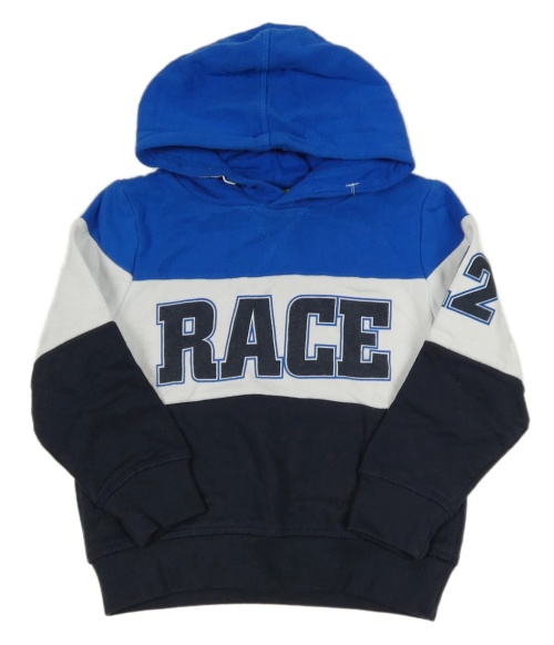 Modro-bielo-tmavomodrá mikina s nápisom a kapucňou
