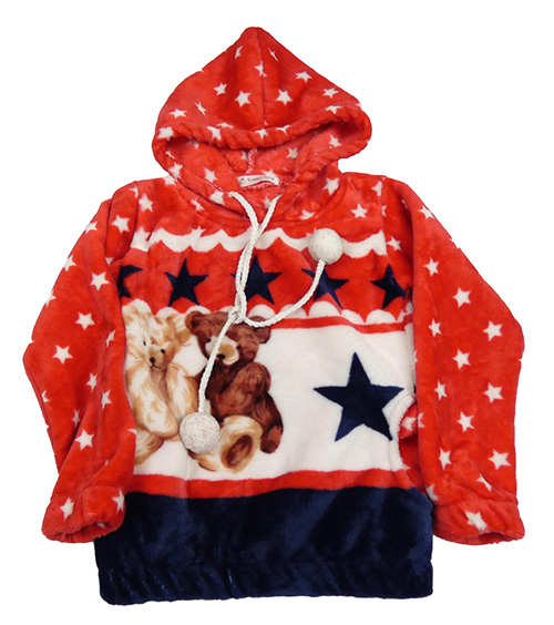 Červeno-bielo-tmavomodrá chlpatá mikina s medveďmi a kapucňou