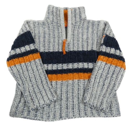 Sivo-tmavomodrý melírovaný žinylkový sveter s pruhmi a stojačikom