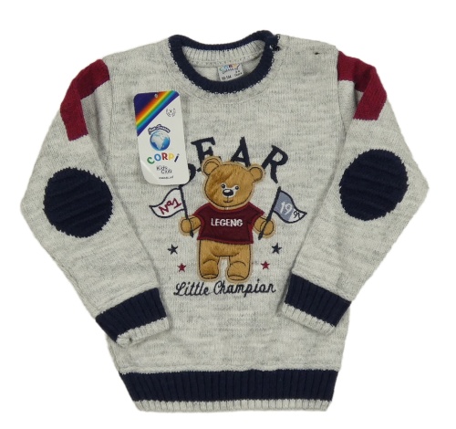 Nové - svetlošedá -tmavomodro-vínový melírovaný vlnený sveter s medvedíkom