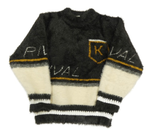 Čierno-smotanový chlpatý sveter s nápismi a erbem