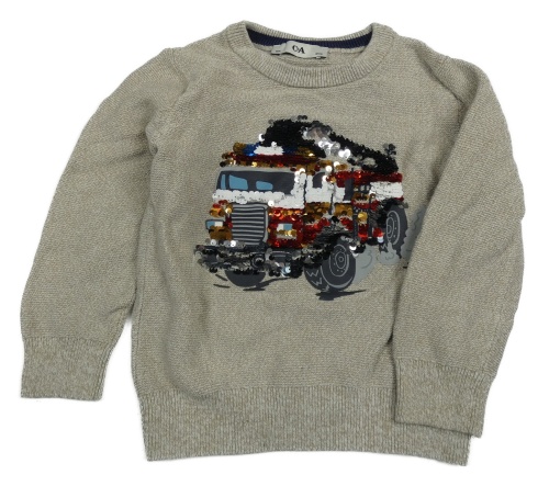 Béžový melírovaný sveter s hasiči s překlápěcími flitre C&A