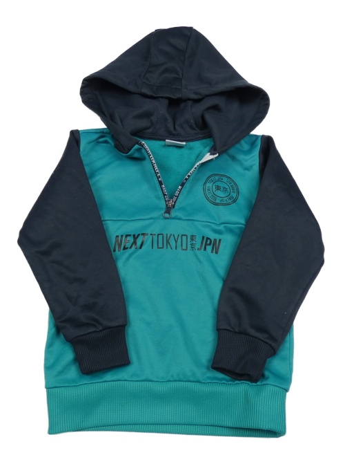 Zeleno-tmavomodrá športová mikina s nápisom a kapucňou