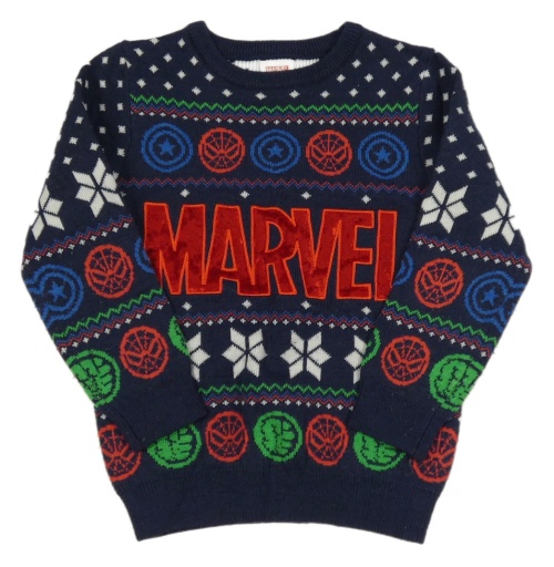 Tmavomodrý sveter so superhrdinami a norský vzorom Marvel