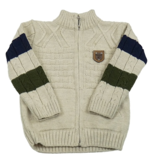 Béžový vlnený prepínaci sveter s nášivkou a pruhy na rukávech