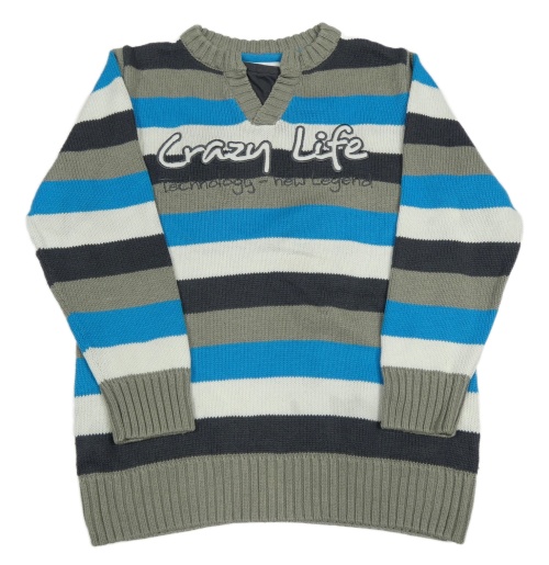Modro-hnedo-smotanový pruhovaný sveter s nápisom Topolino