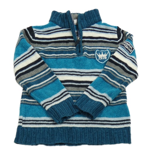 Modrozeleno-bielo-sivo-čierno-petrolejový pruhovaný žinylkový sveter s nášivkami C&A