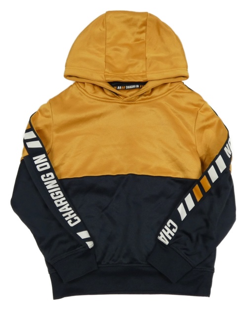 Žlto-tmavomodrá športová mikina s nápisom a kapucňou