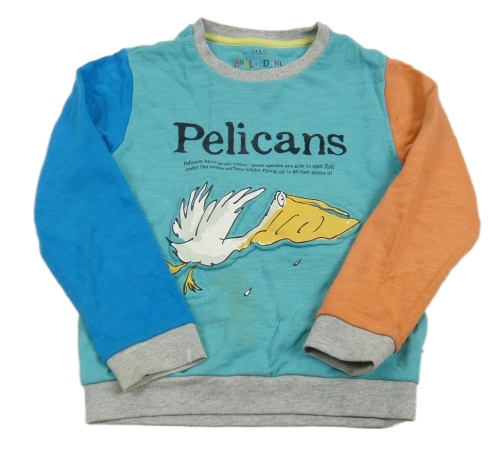 Modrozelená mikina s pelikánom a farebnymi rukávy