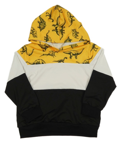 Žlto-bielo-čierna športová mikina s kapucňou a dinosaurami