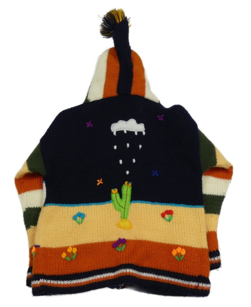 Tmavomodro-vanilkovo-kaki-oranžový prepínaci sveter so zvieratkami a kapucňou s brmbolcom