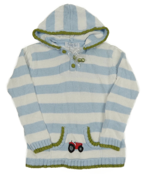 Nové - Světlemodro-biely pruhovaný sveter s traktorom a kapucňou