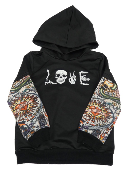 Čierna ľahká mikina so vzorovanymi rukávy a lebkou a kapucňou