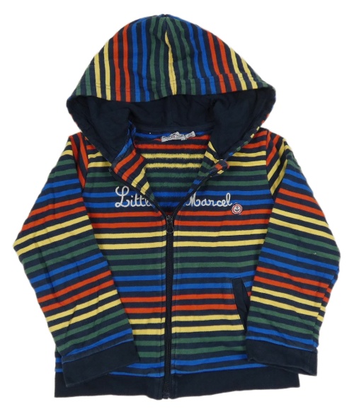 Tmavomodro-farebná pruhovaná prepínaci mikina s nápisom a kapucňou