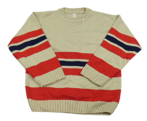 Béžovo-červeno-tmavomodrý pruhovaný sveter