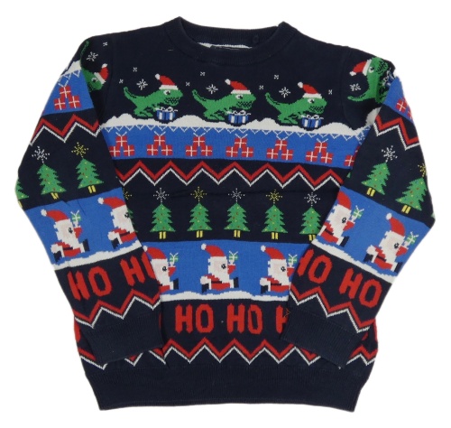 Tmavomodrý sveter s dinosaurami a Santy H&M