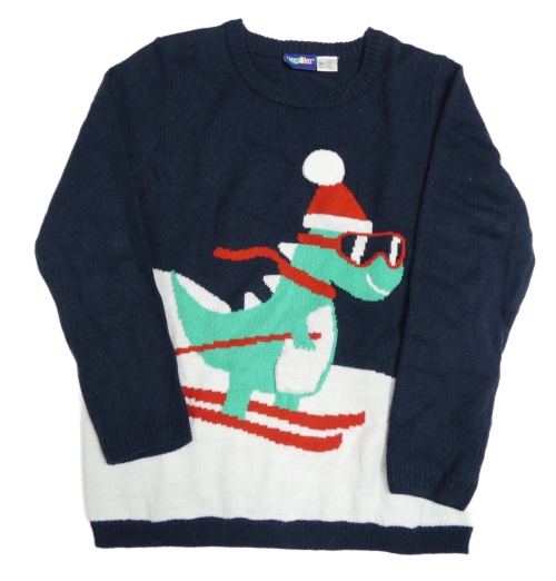 Tmavomodro-biely pletený sveter s dinosaurom s vánočním motívom a blikátkem lupilu