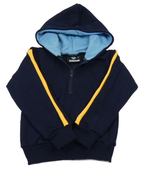 Tmavomodrá mikina so žltým pruhom a kapucňou