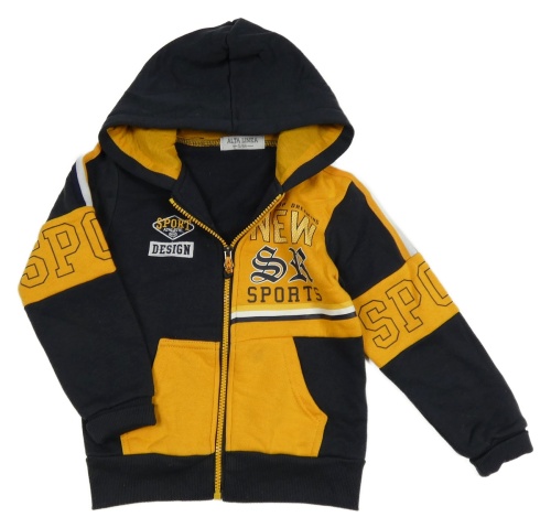 Tmavomodro-horčicový prepínaci sveter s nápismi a pruhmi a kapucňou ALTA LINEA