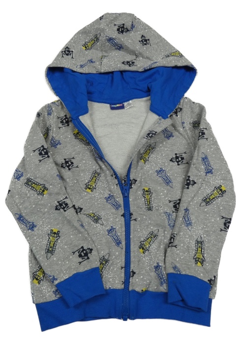 Sivo-cobaltovoě modrá melírovaná skvrnitá prepínaci mikina s raketami a kapucňou lupilu