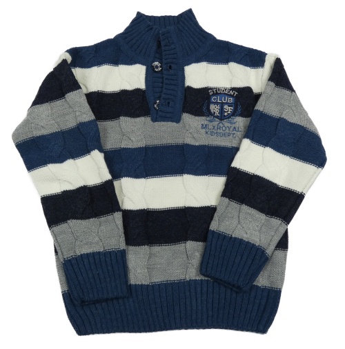 Tmavomodro-bielo-sivý pruhovaný vlnený sveter s nášivkou