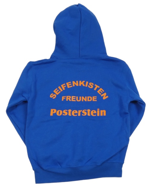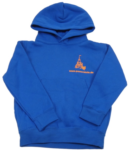 Cobaltovoě modrá tepláková mikina s obrázkom a nápismi a vreckom a kapucňou FRUIT of the LOOM
