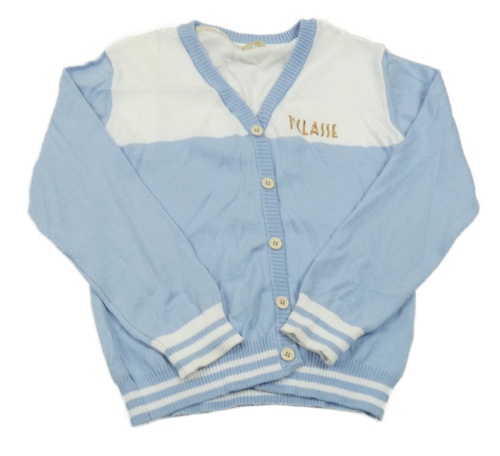 Světlemodro-biely prepínaci sveter s nápisom