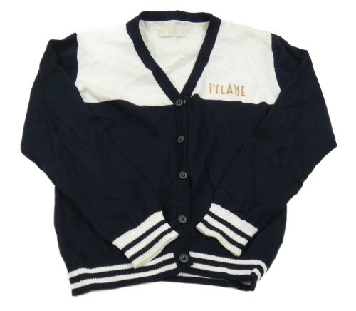 Tmavomodro-biely prepínaci sveter s nápisom