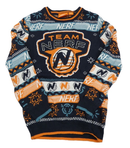 Tmavomodro-modrošedo-oranžový vzorovaný sveter s logy NERF