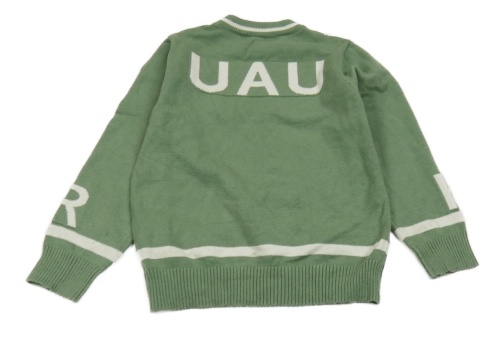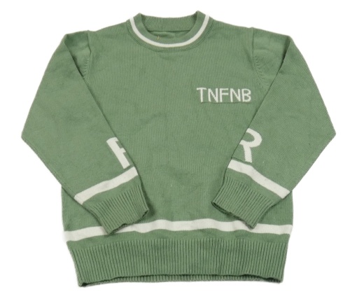Zelený ľahký sveter s bielým pruhom a nápisom